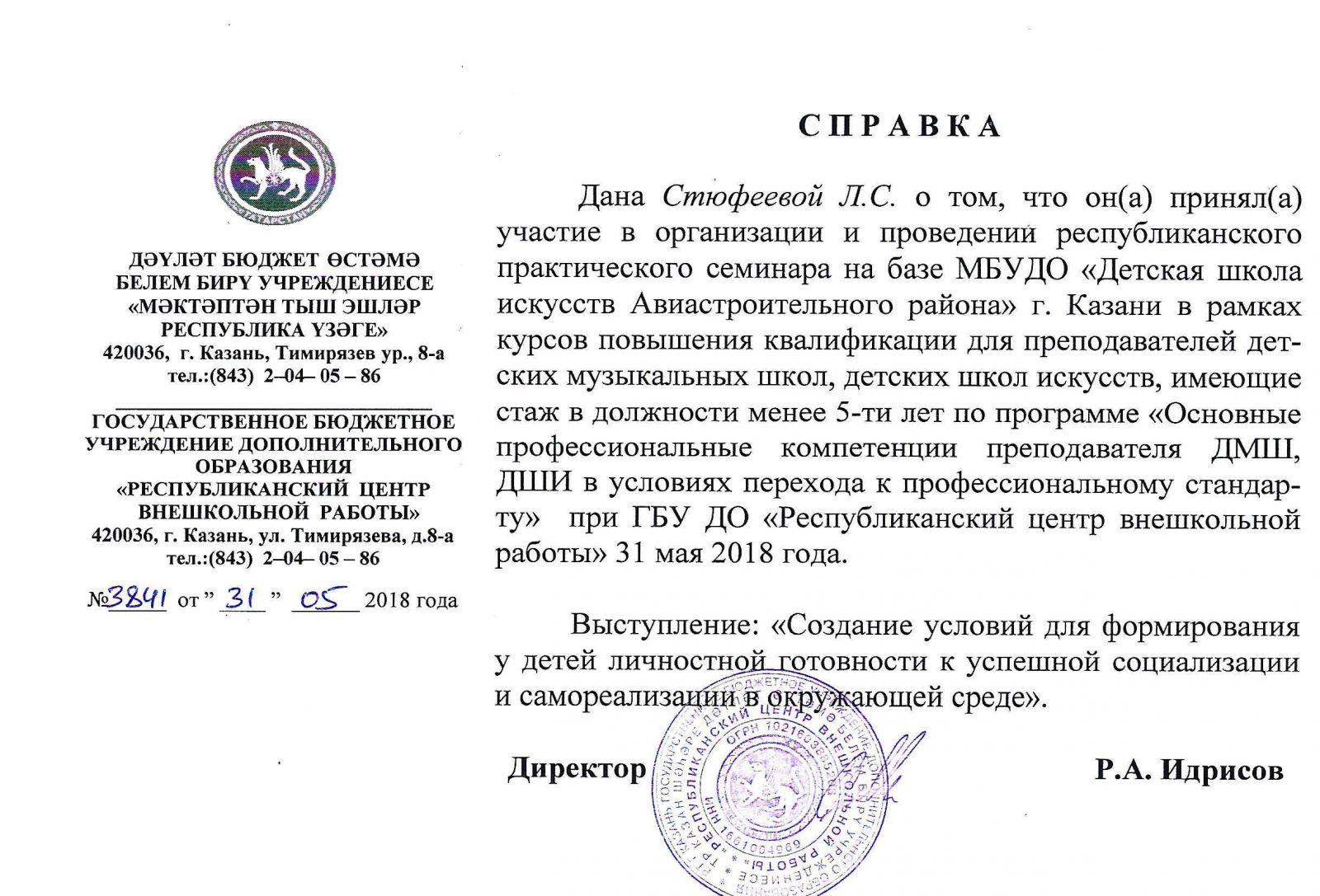 6. Выступлен на площадке обмен педагогическим опытом "Педагогическая мастерская",проведенная в рамках Открытого республиканского фестиваля-конкурса татарского искусства "Мон чишмэсе", Сертификат