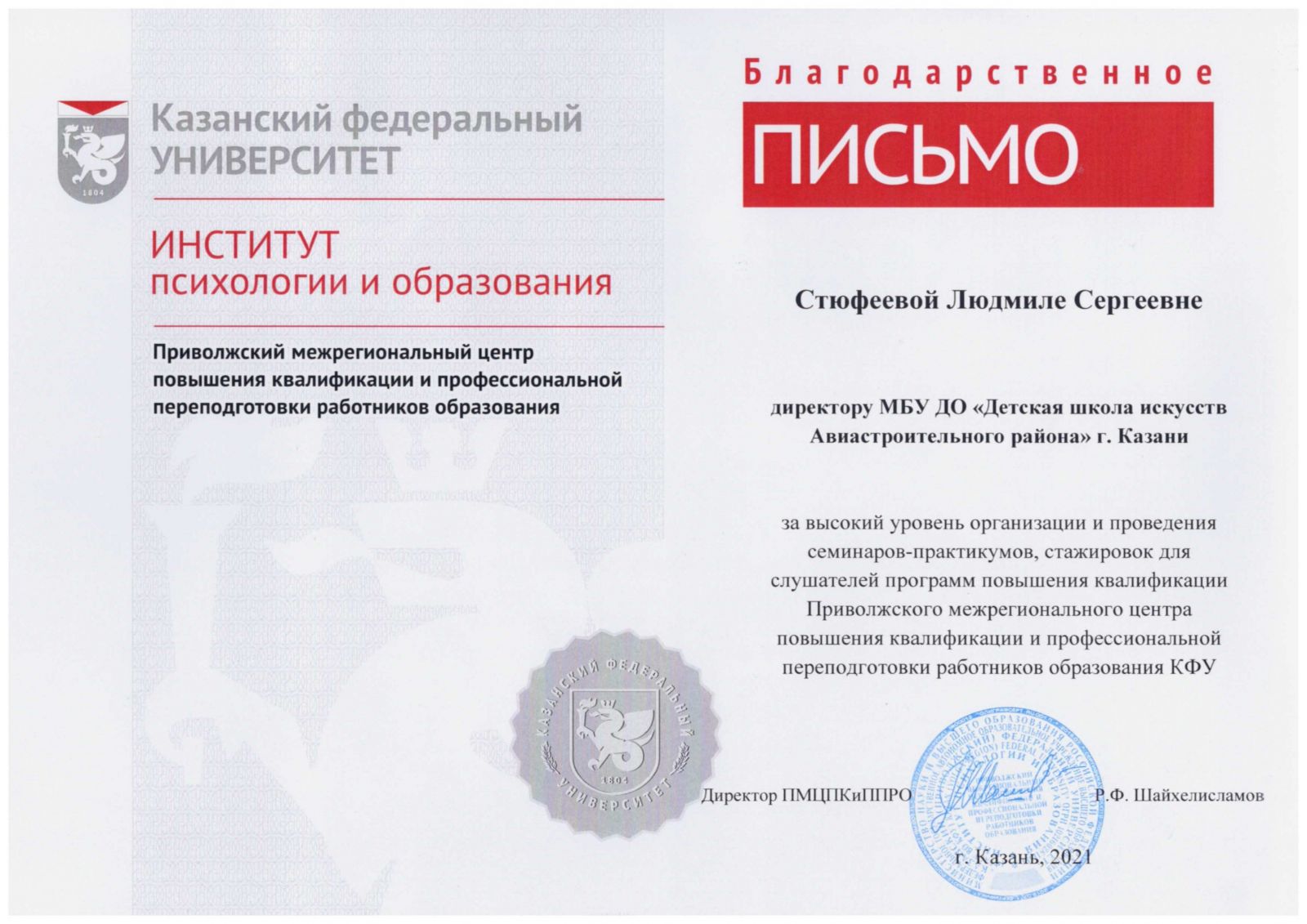2. Благодарственное письмо за высокий уровень организации и проведении семираров-практикумов, стажировок для слушателей программ повышения квалификации от КФУ