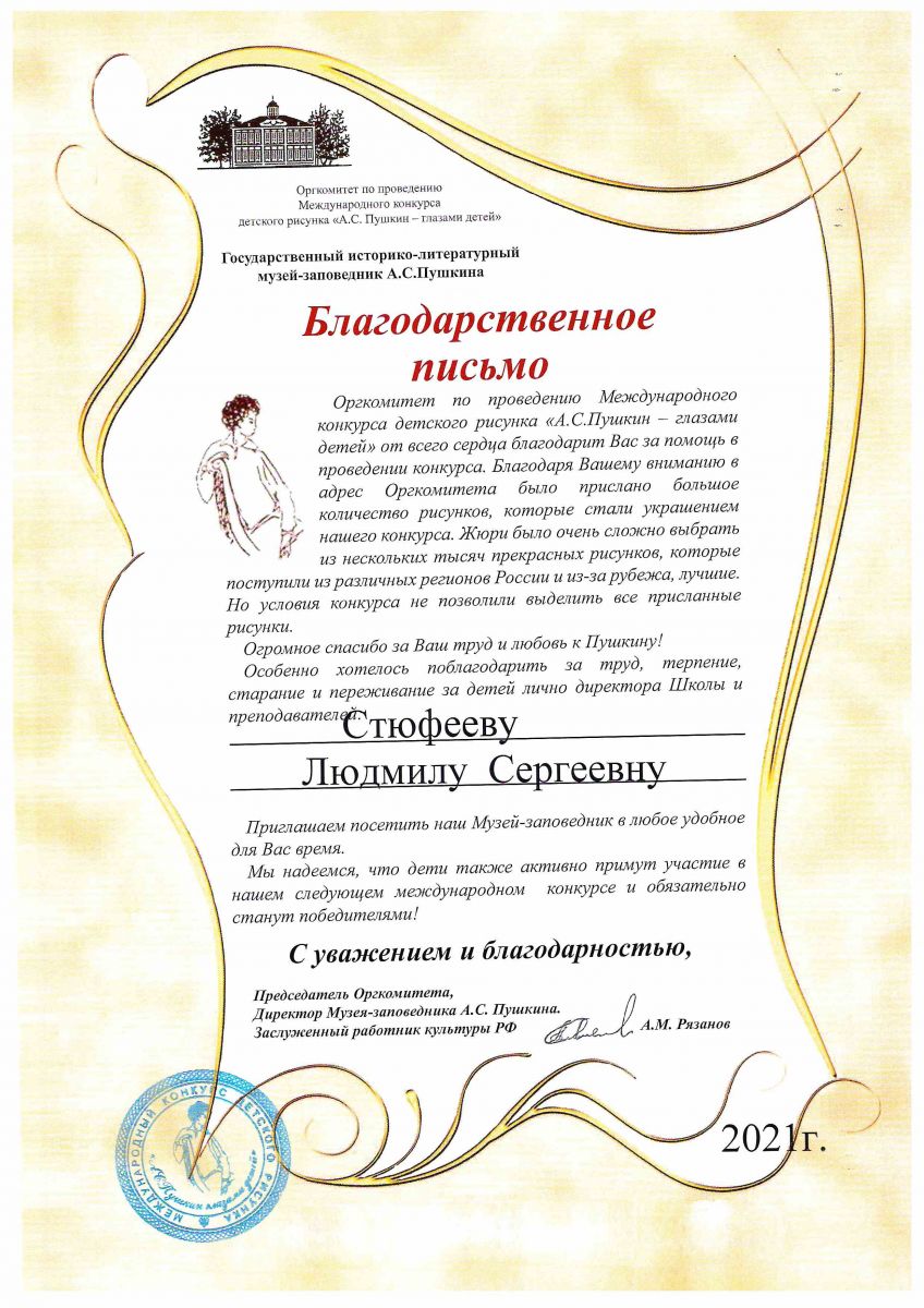 1. Государственный историко-литературный музей-заповедник А.С.Пушкина, Благодарственное письмо