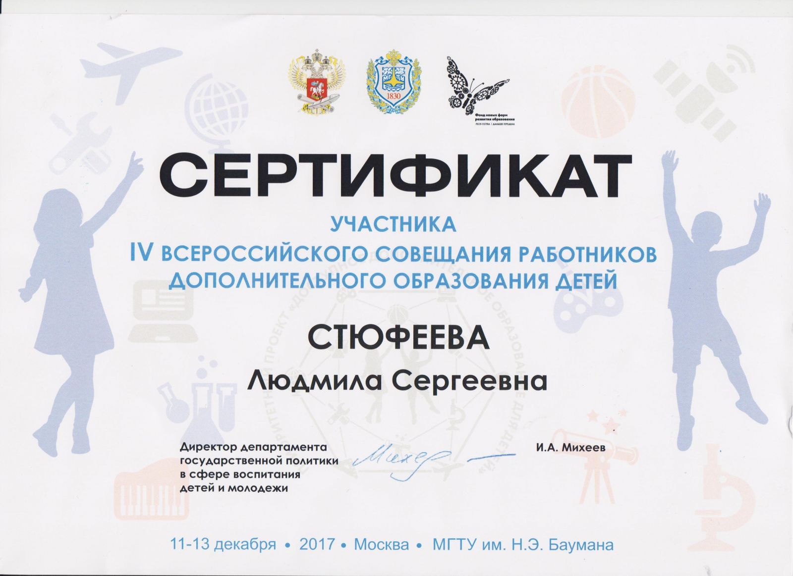 2. СЕРТИФИКАТ участника IV Всероссийского совещания работников дополнительного образования детей Стюфеевой Л.С. Москва 2017