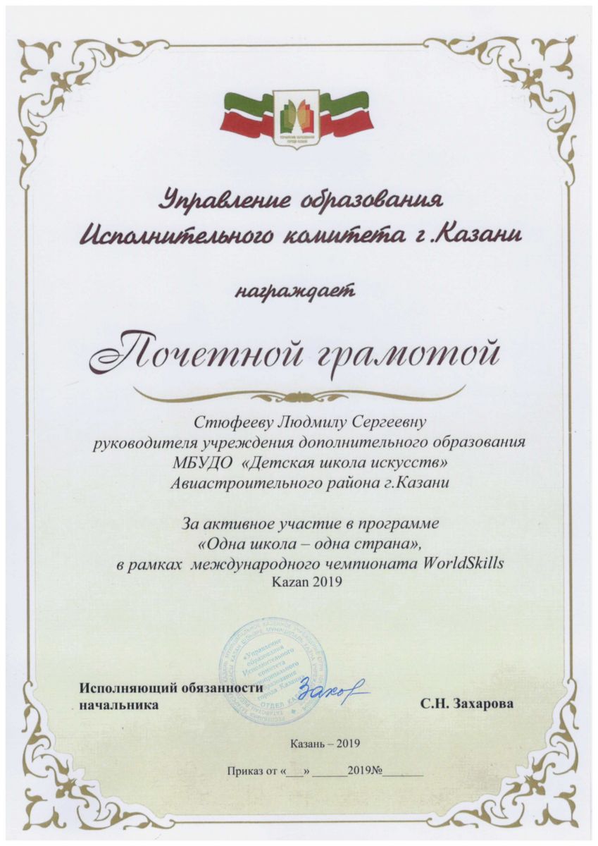 5. Почетная грамота Управления Образования Исполнительного комитета г.Казани За активное участие в программе "Одна школа-одна страна", в рамках международного чемпионата WorldSkills Kazan 2019