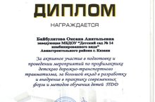 Сегодня начальник территориального управления в г. Казани ГБУ "Безопасность дорожного движения" наградил коллектив детского сада дипломом за активное участие в подготовке и проведении мероприятий по профилактике детского дорожно-транспортного травматизма, за большой вклад в разработку и внедрение в практику соврменных форм и методов обучения детей ПДД