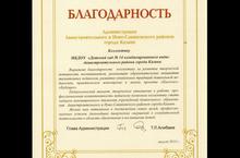 Администрация Авиастроительного и Ново-Савиновского районов города Казани выражает благодарность коллективу детского сада за развитие творческой активности воспитанников, реализацию образовательных инициатив талантливых педагогов, развитие уникальных традиций дошкольной педагогики, практическое воплощение в жизнь проета "Килэчэк"-"Будущее". Молодцы! Так держать!