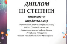 Наш воспитанник, Марданов Амир, учавствовал в республиканском творческом конкурсе "Снежинка", организованным Республиканским олимпиадным центром, и занял достойное 3 место. Руководитель: Насибуллина Лилия Мусаверовна.
