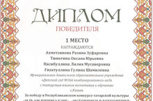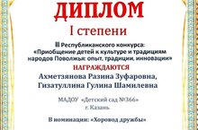 Поздравляем Разину Зуфаровну и Гулину Шамилевну! Педагоги заняли 1 место в республиканском конкурсе "Приобщение детей к культуре и традициям народов Поволжья" в номинации "Хоровод дружбы". Благодарим за проявленную активность.