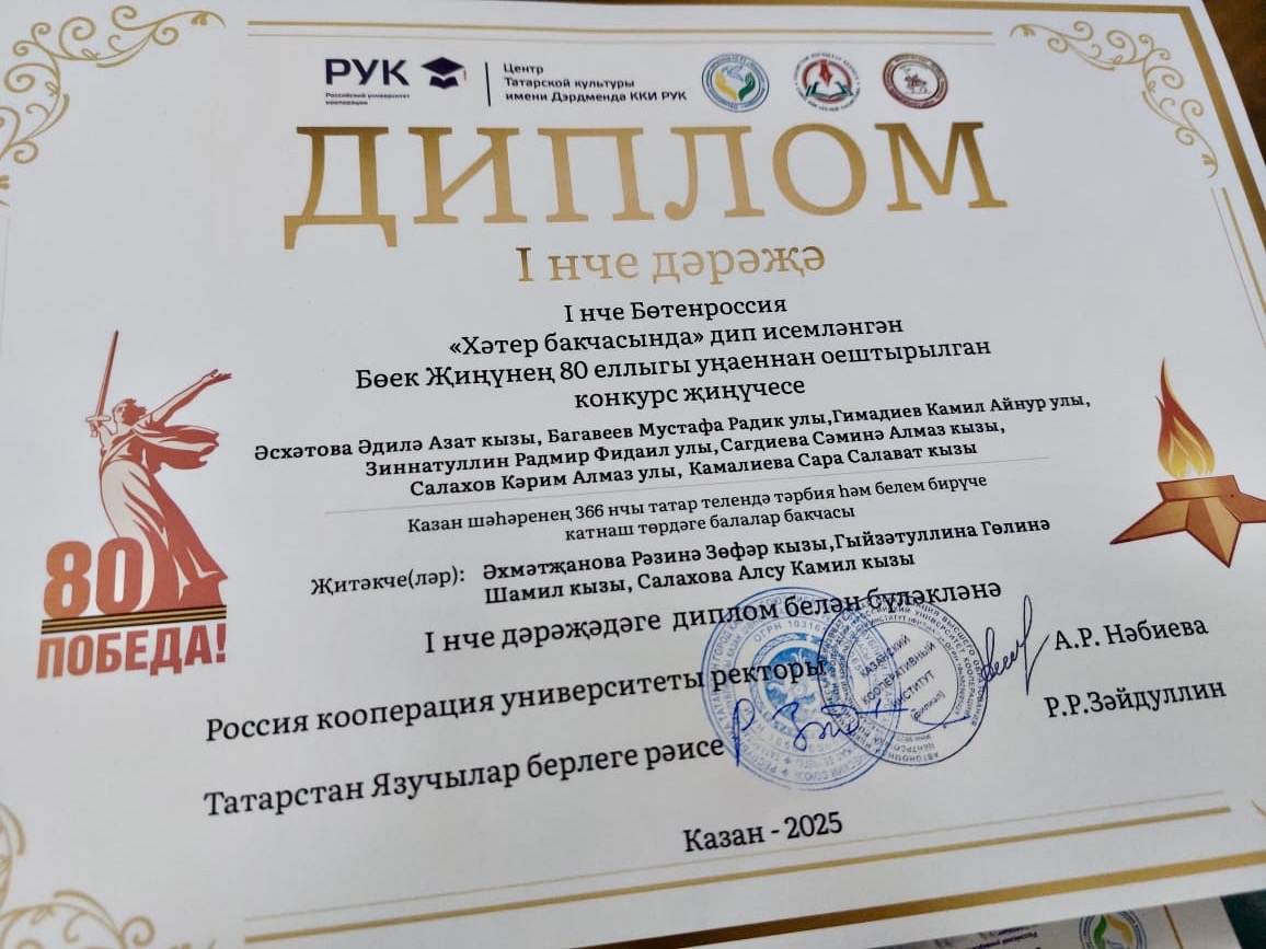 I нче Бөтенроссия "Хәтер бакчасында" дип исемләнгән Бөек Җиңүнең 80 еллыгы уңаеннан оештырылган конкурс җиңүчеләрен һәм аларның җитәкчеләрен Гыйзәтуллина Гөлинә Шамил кызын,Әхмәтҗанова Рәзинә Зөфәр кызын һәм Салахова Алсу Камил кызын тәбриклибез!Эшләрендә зурдан зур уңышлар телибез