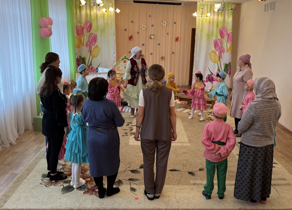 Эльвира Рафильевна совместно с воспитателями по обучению родному (татарскому) языку провели мероприятие "Әйлән- бәйлән".Родители с большим удовольствием совместно с детьми поиграли в давно забытые игры. Татарские народные игры являются неотъемлемой частью интернационального, художественного и физического воспитания детей. Формируется устойчивое, заинтересованное, уважительное отношение к культуре родного края.