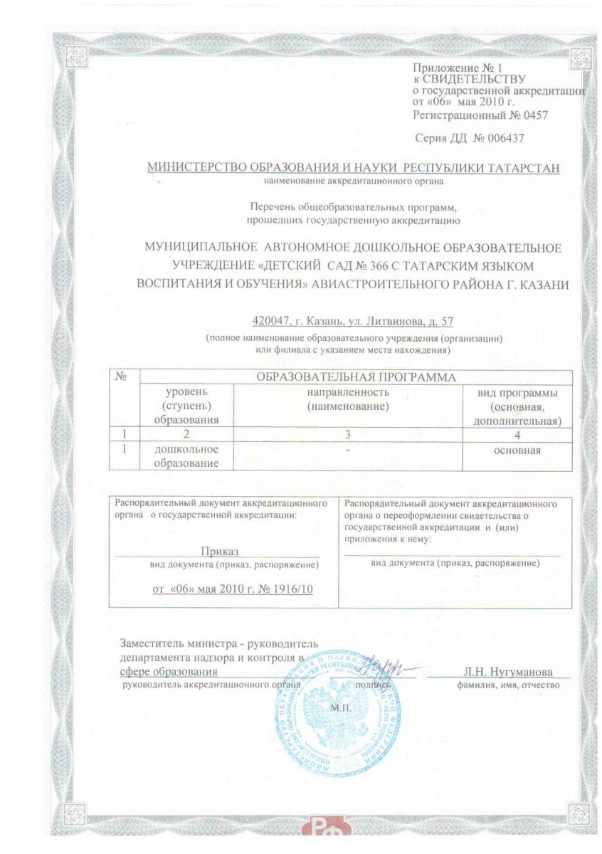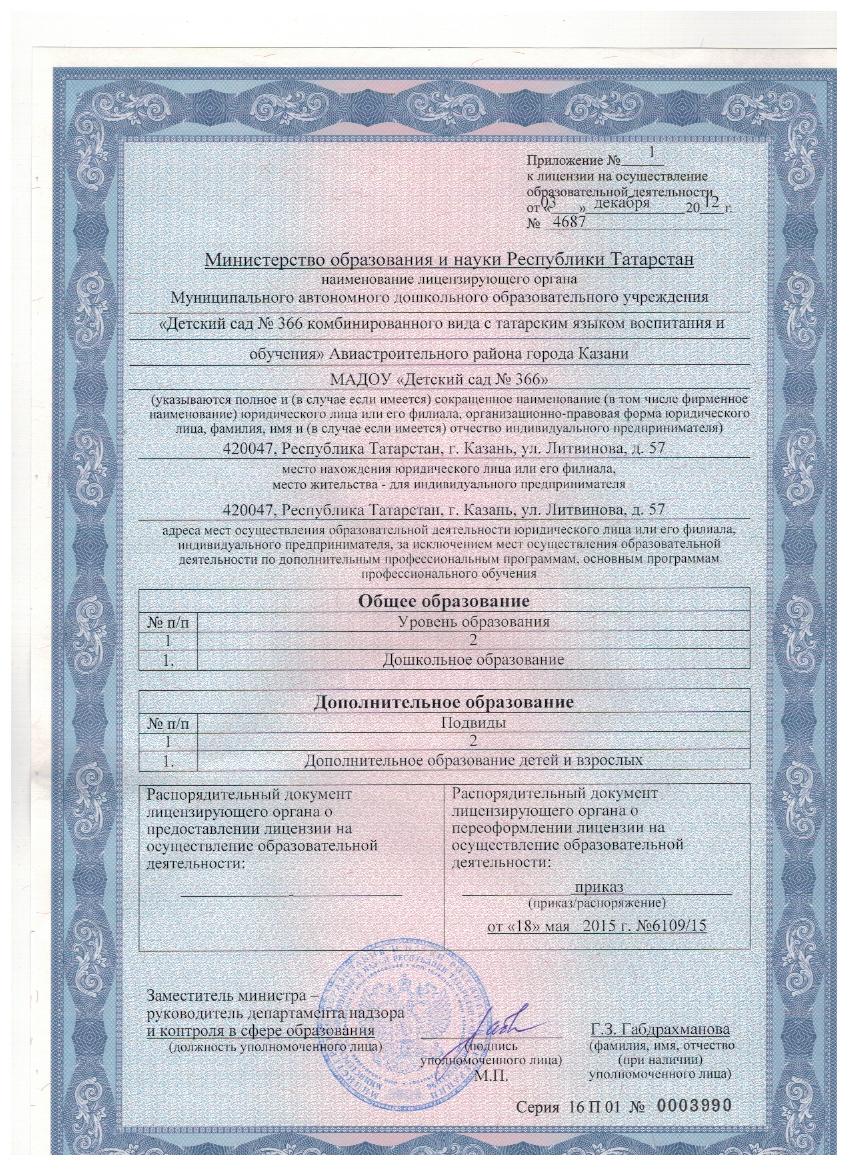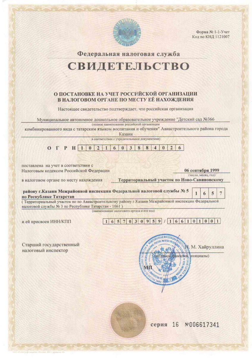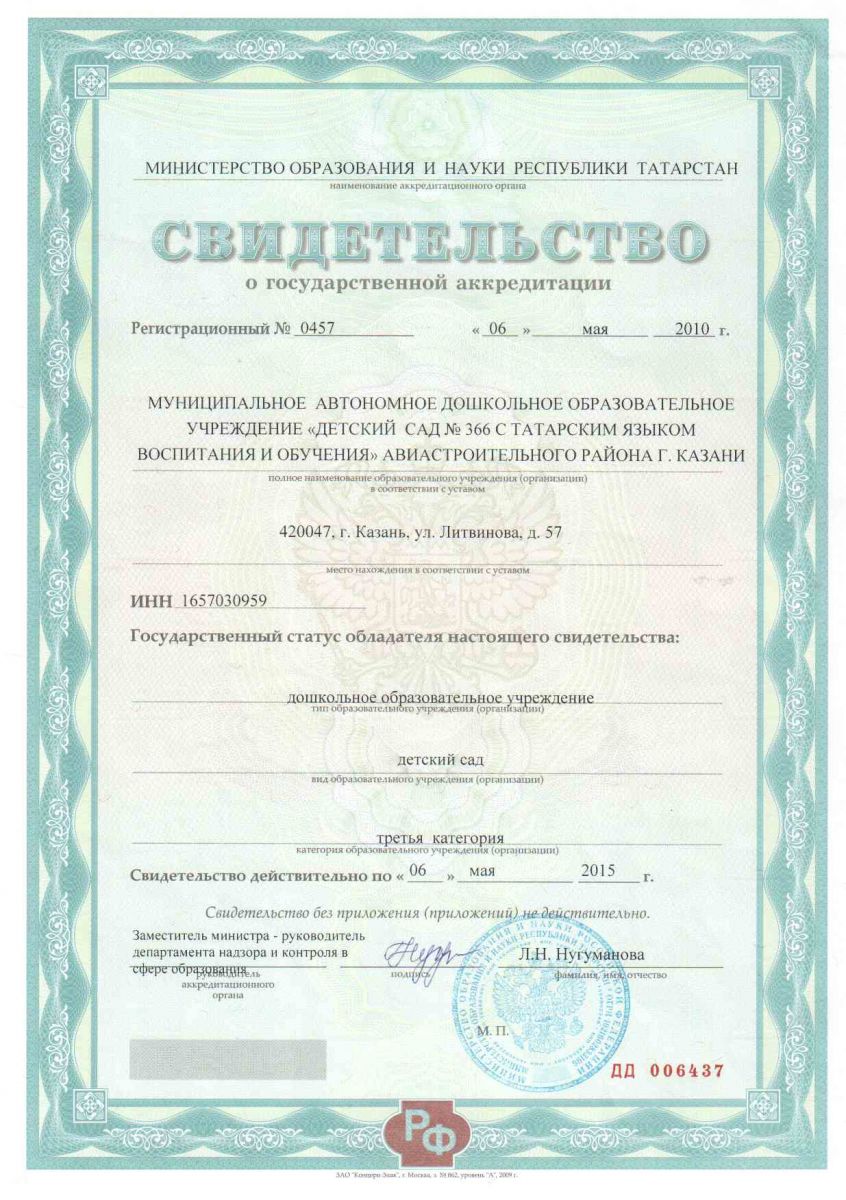 Полное наименование: Муниципальное автономное дошкольное образовательное учреждение "Детский сад № 366 комбинированного вида с татарским языком воспитания и обучения" Авиастроительного района города Казани.