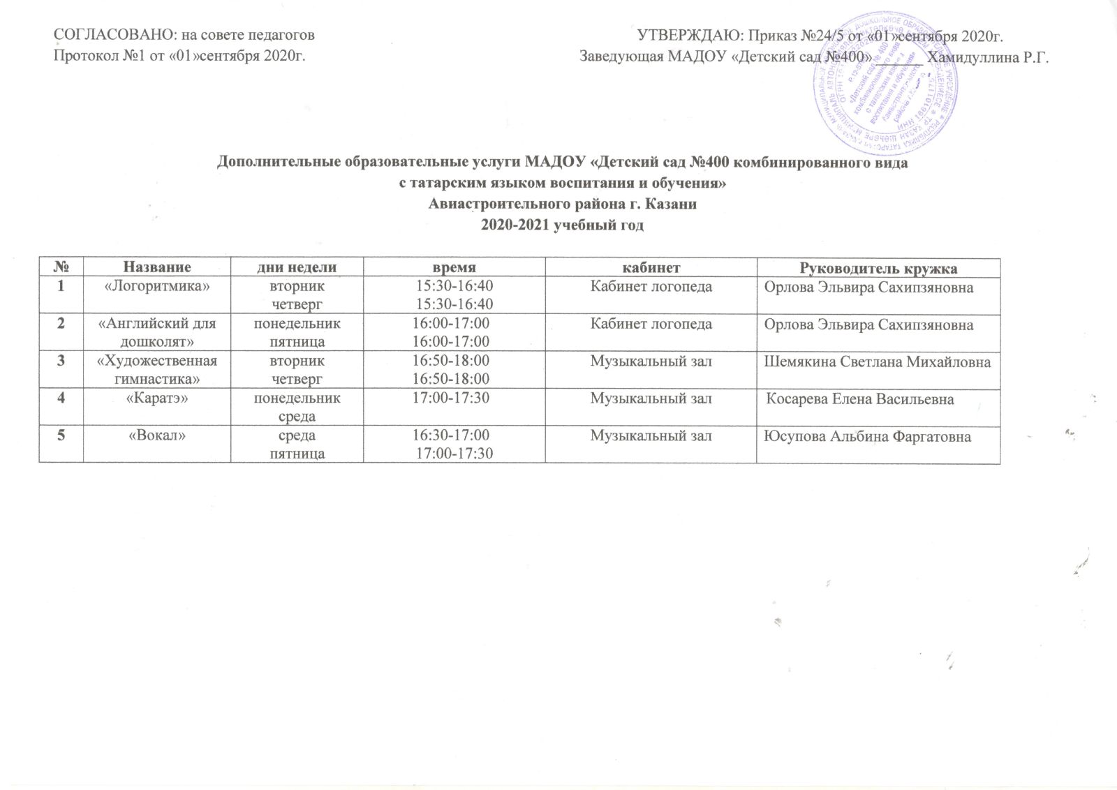 Расписание занятий по реализации дополнительных услуг на 2020-2021 учебный год