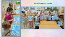 Морозные узоры только на первый взгляд кажутся белыми, они переливаются всеми цветами радуги. Но всё же преобладают холодные цвета. Это - синий, голубой, фиолетовый, сиреневый. А почему они холодные? С чем их можно сравнить? (со снегом, льдом, морозом). В морозных узорах можно увидеть волшебные сады, в которых растут необыкновенные деревья и цветы. В таком саду можно встретить колосок, пёрышко, астру и хризантему, веточки ели или сосны. Ребята группы «Радуга» выводили на листе бумаги узоры на окне. Волшебное занятие принесло радость детям. -