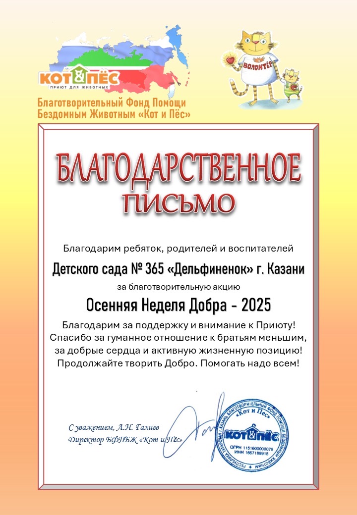 Администрация детского сада и благотворительный фонд «Кот и Пес» выражает глубокую признательность всем педагогам, родителям и детям за участие в этом благородном деле.