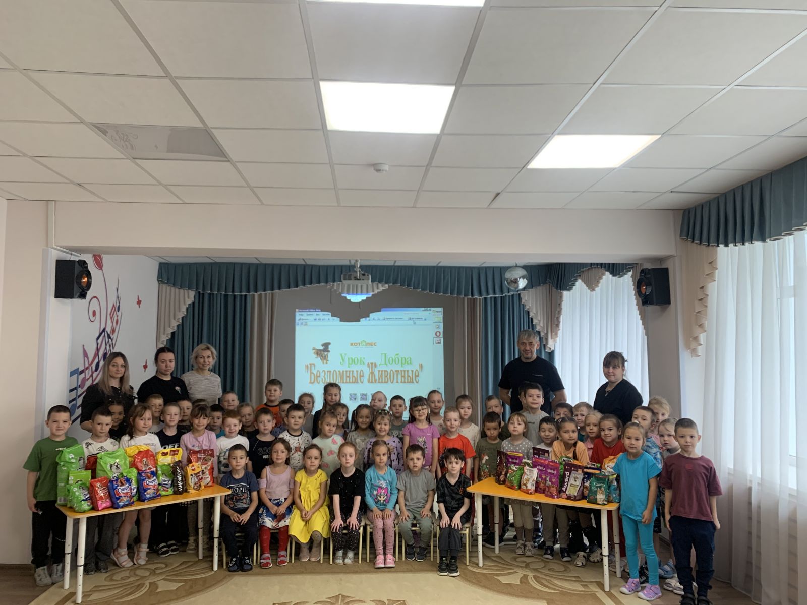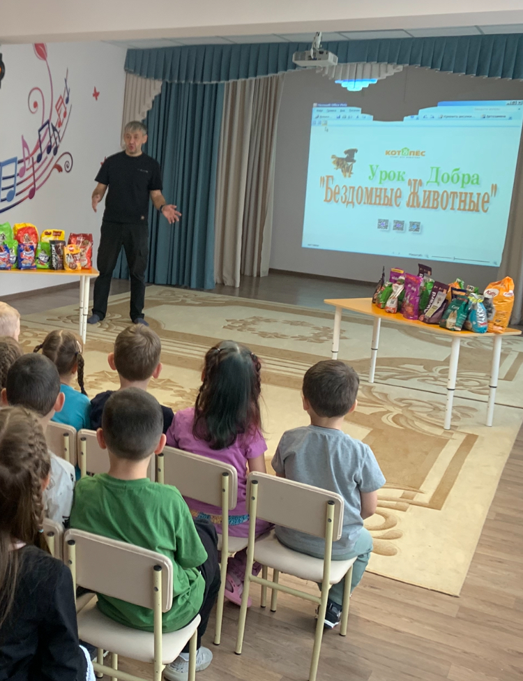 Главным гостем проекта стал директор благотворительного фонда помощи бездомным животным «Кот и Пес» Альберт Галиев, который провел с воспитанниками старшей и подготовительных групп Урок Добра с демонстрацией фильма, где рассказал о животных, которые живут в приюте, истории как они туда попали, как им можно помочь, также об ответственном отношении к братьям нашим меньшим.