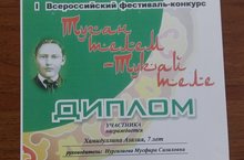 Поздравляем Хамидуллину Азалию с прекрасным выступлением на 1 Всероссийском фестивале-конкурсе "Туган телем - Тукай теле". Желаем дальнейших творческих побед!