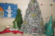 В преддверии Нового года в детском саду проходит выставка "Новогодние красавицы". Родителям предлагалось совместно с детьми изготовить елочку из любого, понравившегося материала. Мы были приятно удивлены фантазии наших родителей! Они сделали елочки из ткани, бисера, бумаги, салфеток, ватных дисков, мишуры, елочных игрушек....