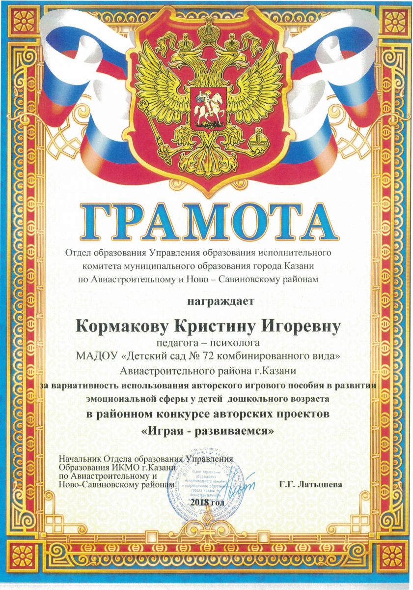 Грамота в районном конкурсе авторских проектов Играя - развиваемся, 2018 год.