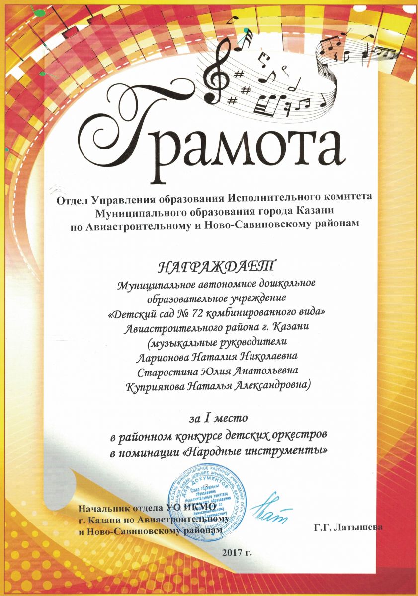 Грамота за 1 место в районном конкурсе детских оркестров, 2017г