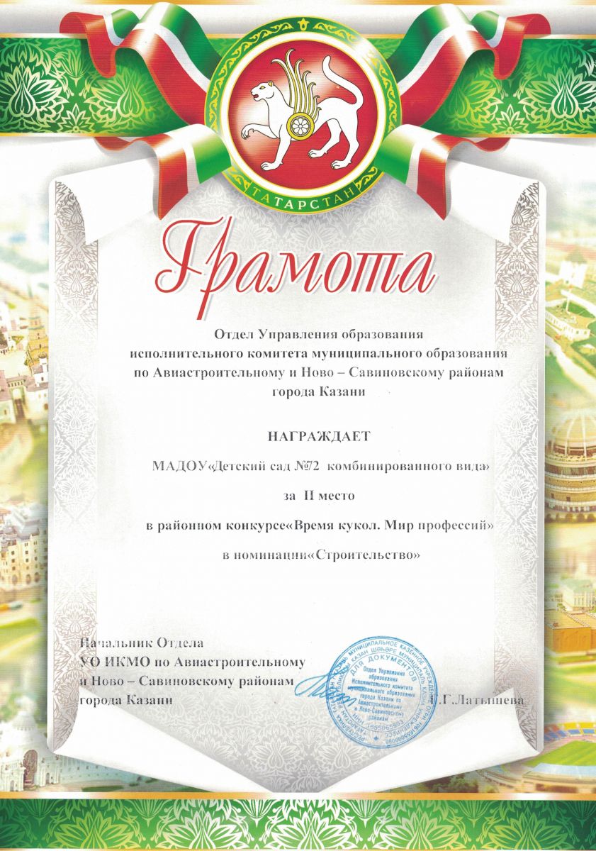 Грамота за 2 место в районном конкурсе Время кукол Мир профессий, 2018 год.