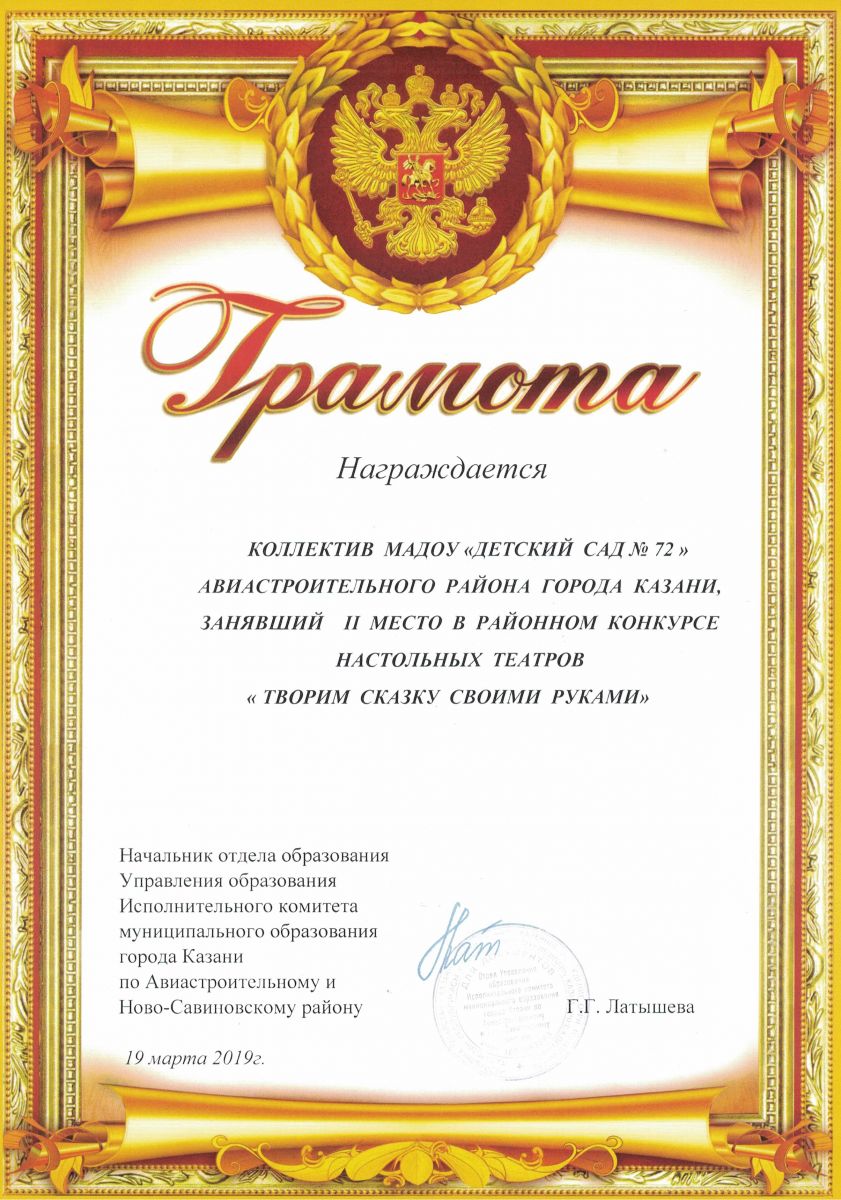 Грамота за 2 место в районном конкурсе настольных театров Творим сказку своими руками, 2019