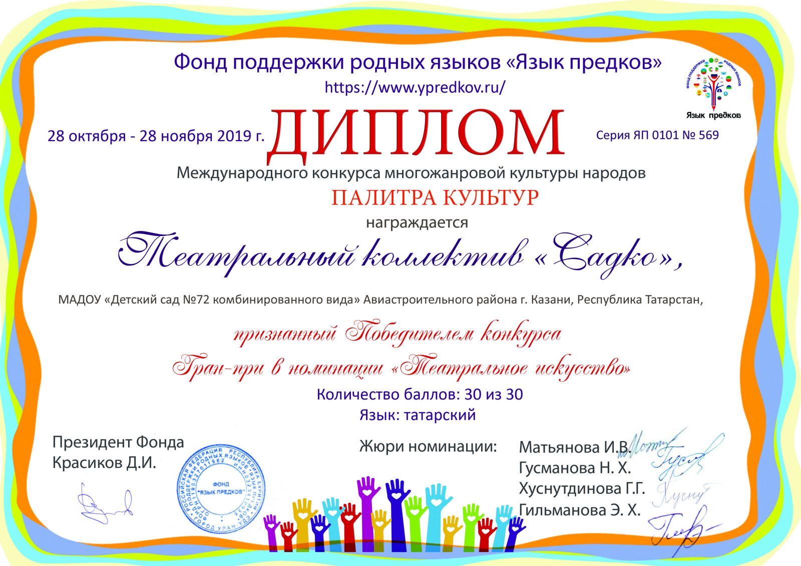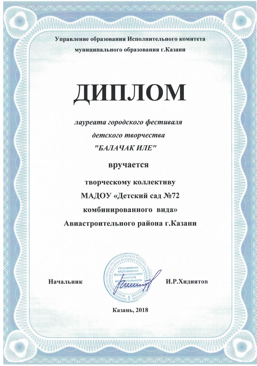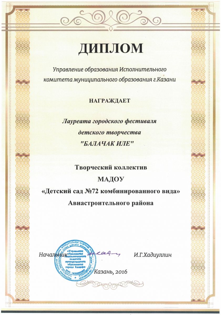 Диплом Управления образования г. Казани "Лауреат городского фестиваля Балачак иле 2016".
