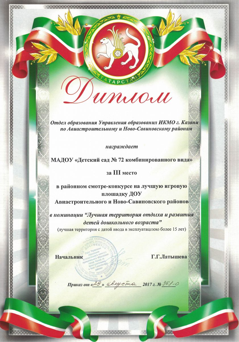 Диплом за 3 место в районном смотре - конкурсе на лучшую игровую площадку ДОУ, 2017 год.
