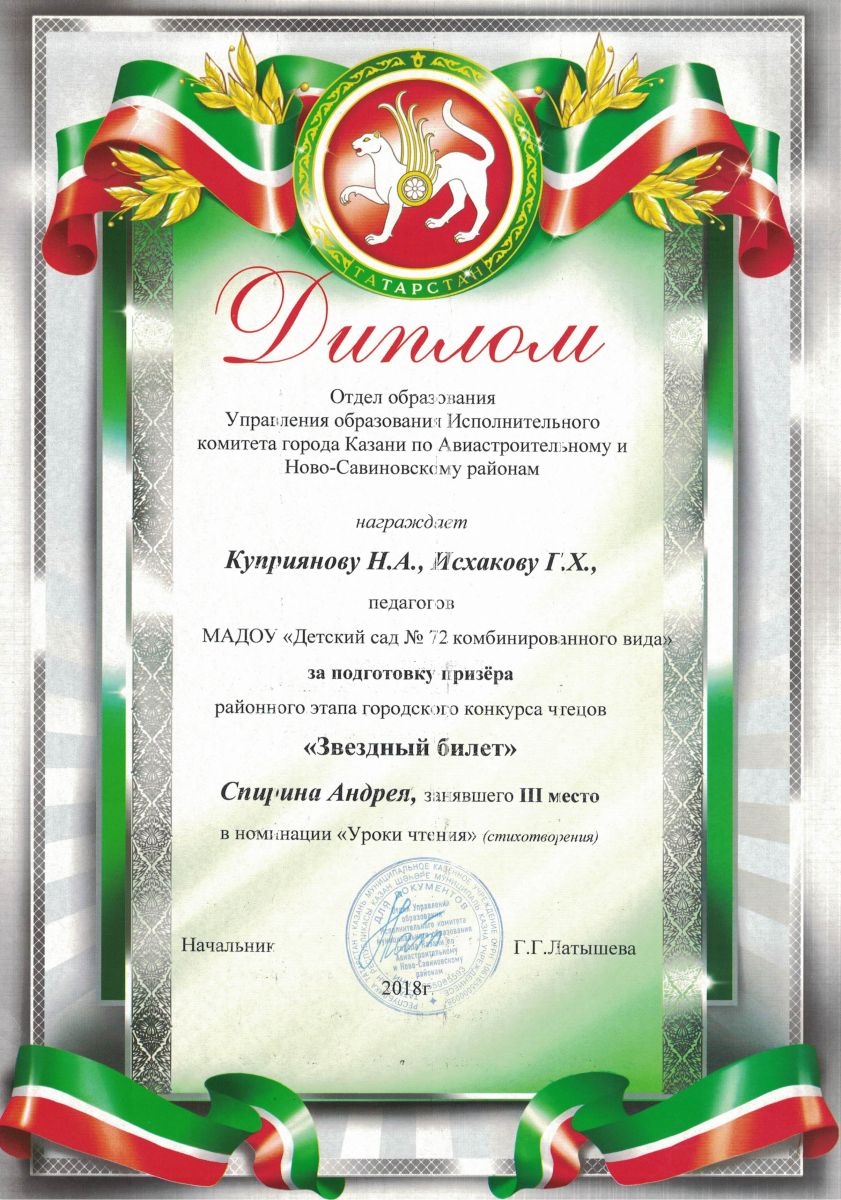Диплом за 3 место районного этапа городского конкурса чтецов Звёздный билет, 2018 год.