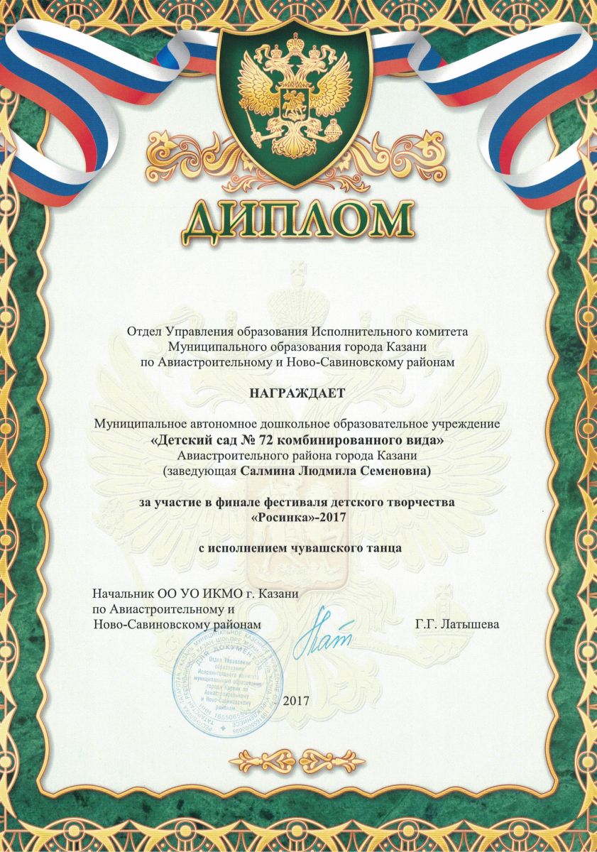 Диплом за участие в финале фестиваля детского творчества Росинка-2017.