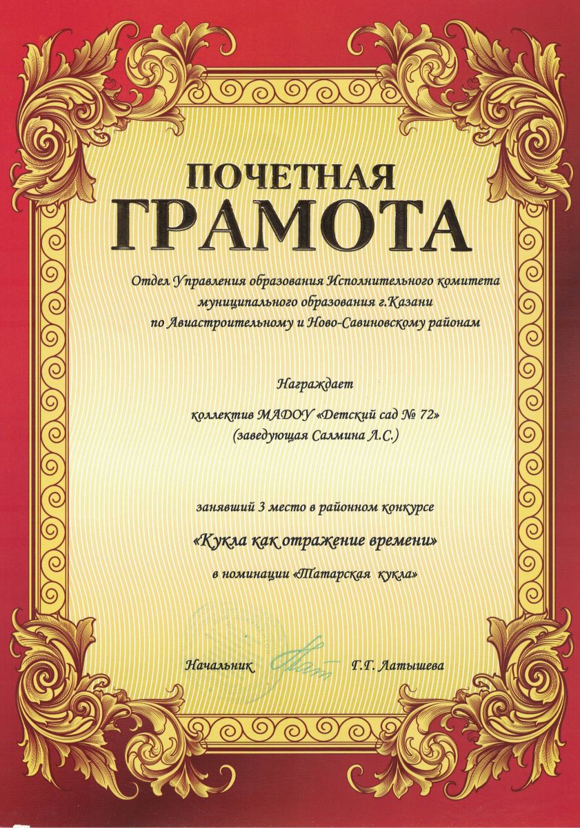 Почетная грамота за 3 место в районном конкурсе Кукла как отражение времени, 2018 год