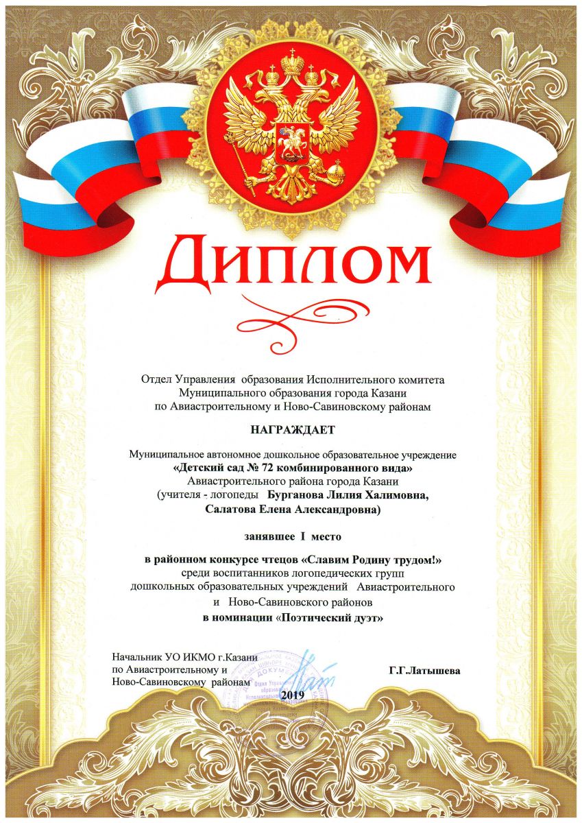 Диплом Отдела Управления образования за 1 место в конкурсе чтецов