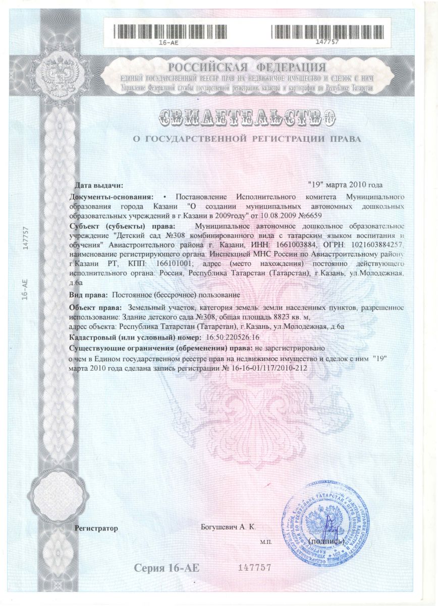 Свидетельство о государственной регистрации права на земельный участок под здание детского сада