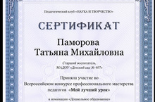 Татьяна Михайловна поздравляем вас с участием во Всероссийском конкурсе профессионального мастерства педагогов "Мой лучший урок" в номинации "Дошкольное образование"Огромная благодарность за то, что вы нашли время принять участие в конкурсе. Благодаря вашим разработкам многие педагоги смогут оценить преимущества использования новых технологий в различных предметных областях.Желаем вам сохранения и умножения жизненной энергии, новых творческих замыслов и их успешной реализации, крепкого здоровья и неиссякаемого оптимизма.Мы поздравляем всех победителей и участников конкурса "Мой лучший урок" -