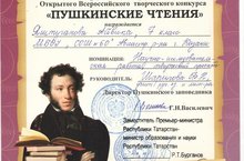 Ученица 7Б класса Яштуганова Айвика стала лауреатом Открытого Всероссийского творческого конкурса "Пушкинские чтения". Руководитель Шарипова Ф.Н.