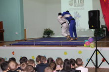 В целях пропаганды ЗОЖ, тренеры спортшколы "Мотор" провели матер-класс по дзюдо ученикам начальной школы.