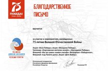Нашей школе вручается благодарственное письмо за участие в мероприятиях, посвященных 75-ЛЕТИЮ ВЕЛИКОЙ ОТЕЧЕСТВЕННОЙ ВОЙНЫ