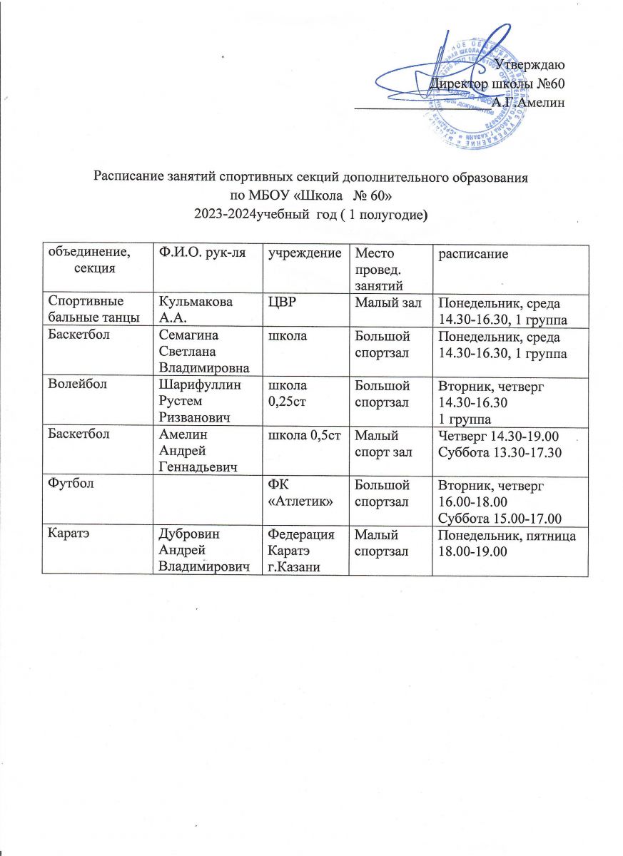 Режим работы секций дополнительного образования МБОУ "Школа №60" 2023/2024 1 полугодие