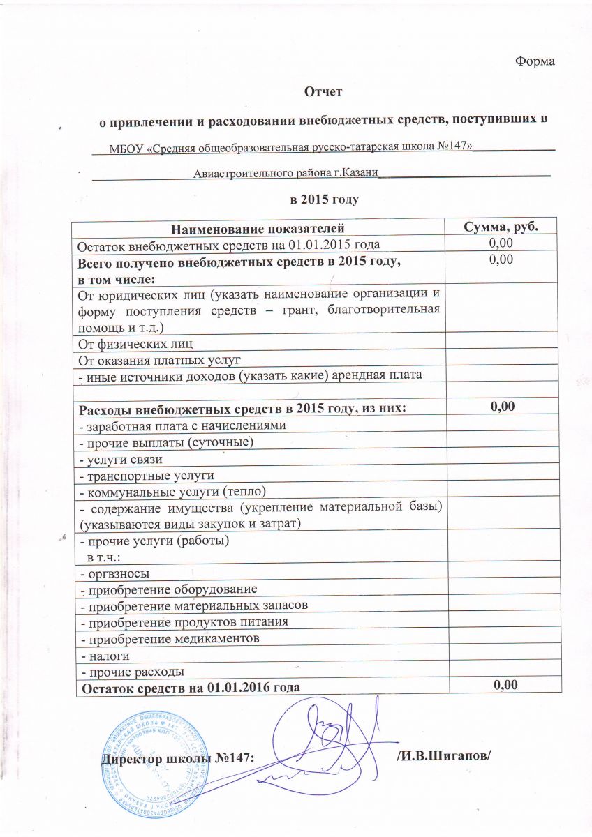 Отчет о привлечении и расходовании внебюджетных средств ,поступивших в ОУ 2015г.