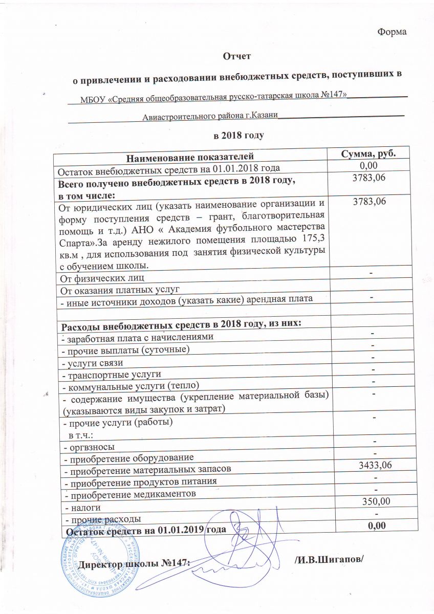 Отчет о привлечении и расходовании внебюджетных средств поступивших в ОУ 2018 г.