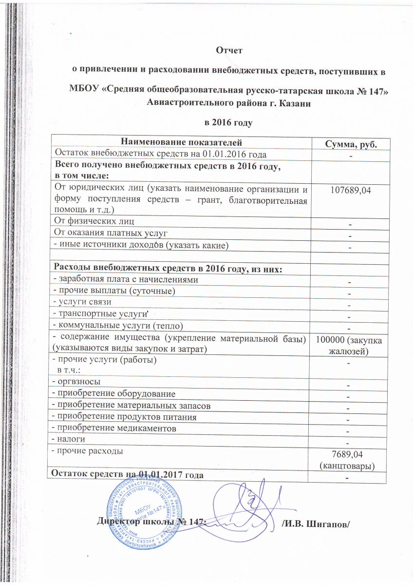 Отчет о привлечении и расходовании внебюджетных средств поступивших в ОУ 2016 г.