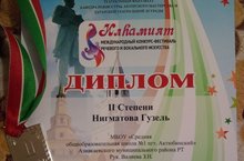 Учащаяся 11 класса, Нигматова Гузель, получила диплом 2 степени в Международном конкурсе речевого исполнительства в номинации "Сольное выступление" с произведением собственного сочинения. Руководитель Валиева З. Н.