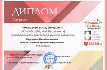 «Рәхмәтем сиңа, Остазым!» («Спасибо тебе, мой Наставник!») -Республиканский конкурс проводился в рамках стратегии развития образования Республики Татарстан на 2017-2021 годы и на период до 2030 года и приурочен к объявлению 2023 года в России Годом педагога и наставника. В ходе конкурса ученик 8 - Б класса - Фартдинов Нияз - сочинил произведение, посвященное своему учителю/наставнику, и направил его в оргкомитет конкурса. Нияз успешно участвовал в этом конкурсе, был удостоен звания лауреата и награжден дипломом. Я от всей души поздравляю Нияза! -
