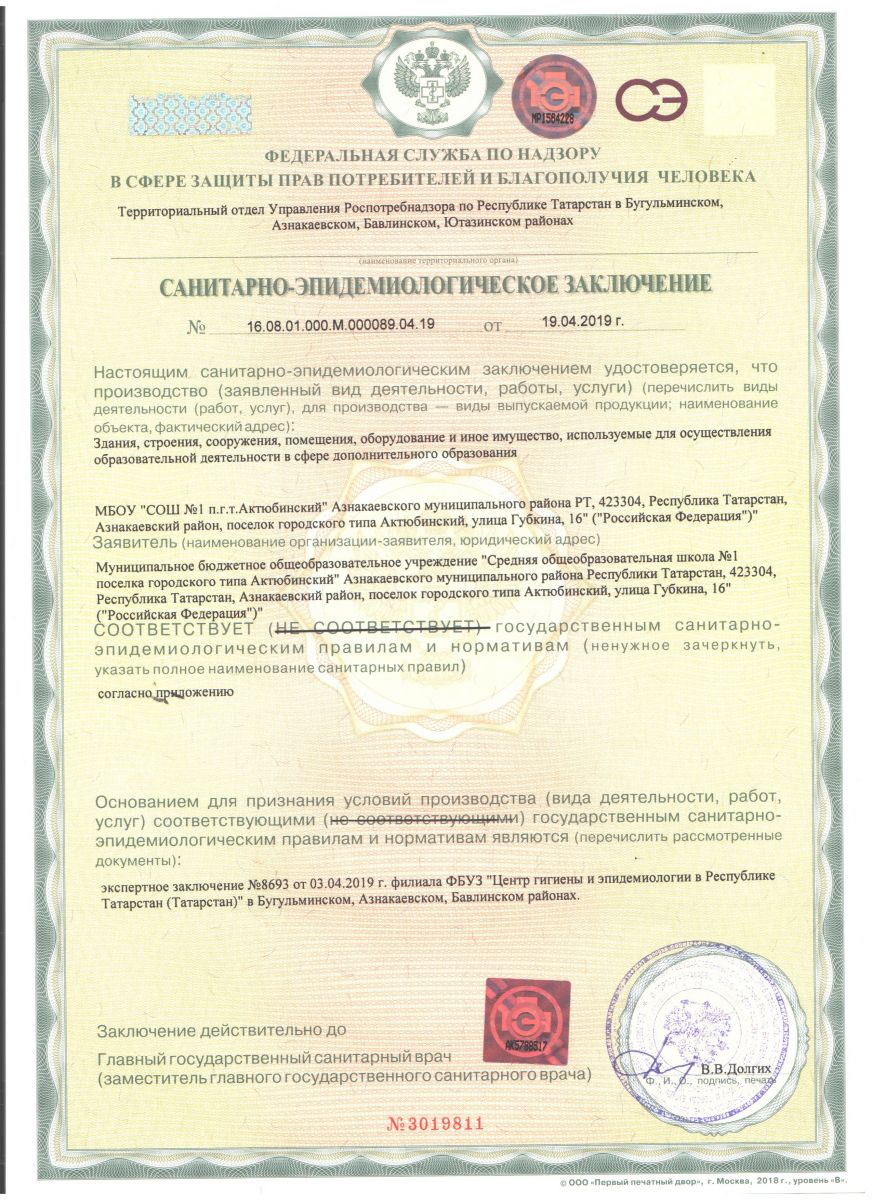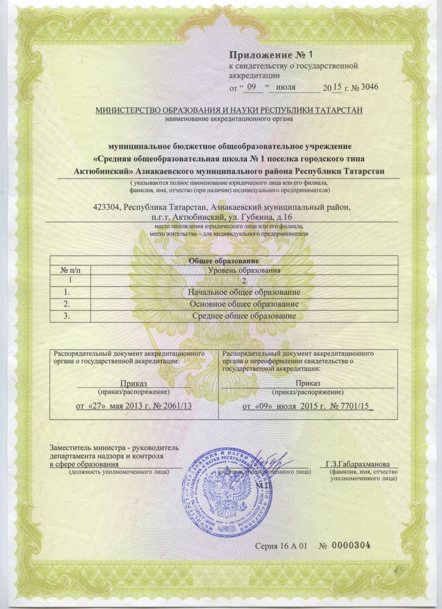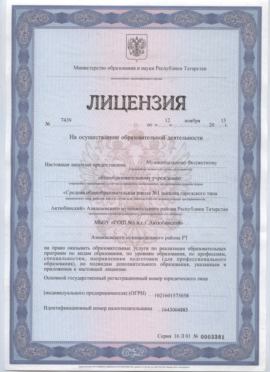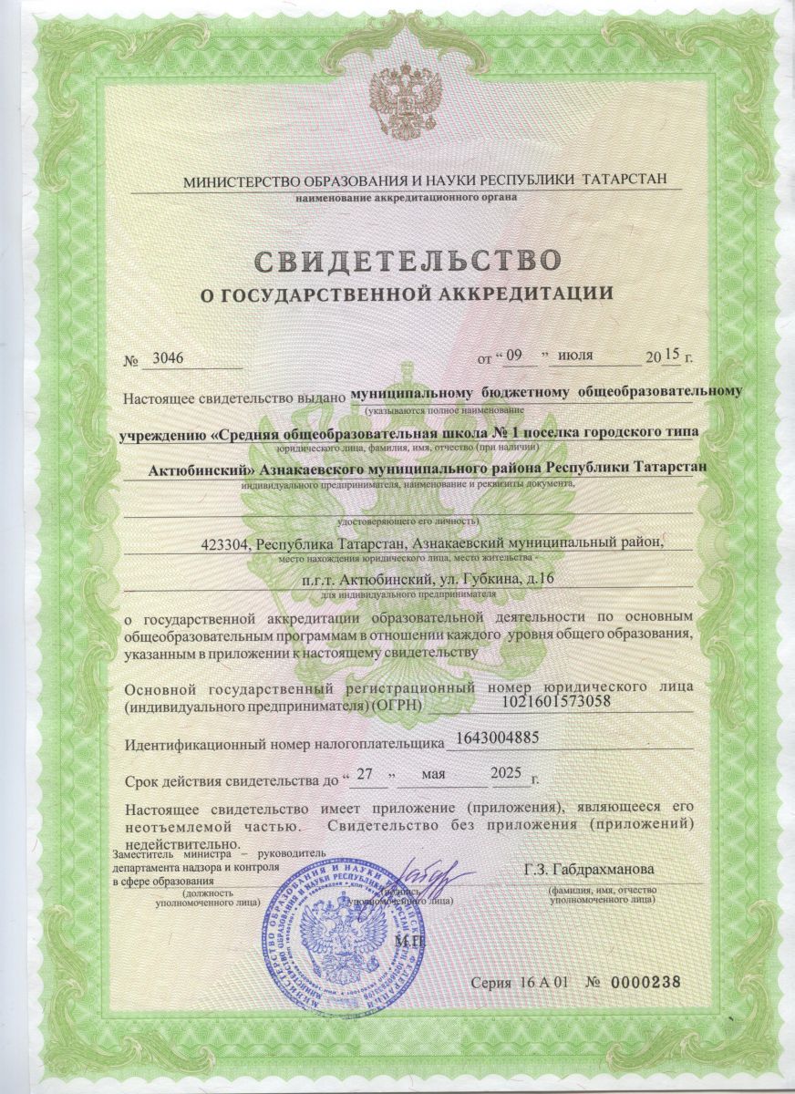 МБОУ «Средняя общеобразовательная школа №1 пгт. Актюбинский» Азнакаевского муниципального района РТ Муниципаль бюджет гомуми белем бирү учреждениесе Татарстан Республикасы Азнакай муниципаль районы Актүбә ш.т.п. 1 нче урта гомуми белем бирү мәктәбе