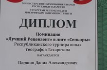Ученику 10a класса МБОУ " СОШ2 пгт Актюбинский" Паршину Данилу вручен диплом в номинации "Лучший Рецензент" в лиге "Сеньоры" Республиканского турнира юных географов Татарстана.