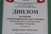 Ученику 10a класса МБОУ " СОШ2 пгт Актюбинский" Закирову Азамату вручен диплом III степени в личном первенстве в лиге "Сеньоры" Республиканского турнира юных географов Татарстана.