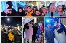 Учащиеся 5-6классов на новогоднем представлении "Уличный театр" "Пингвины". Все дети зарядились новогодним настроением.