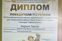 Ученик 6 б класса нашей школы Гирчук Кирилл , под руководством Зиннатуллиной З.В, стал ПРИЗЕРОМ Республиканской НПК им. Героя Советского Союза Газинура Гафиатуллина.