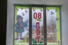 Украшение окон школы учащимися и родителями 7В класса ко Дню Победы.