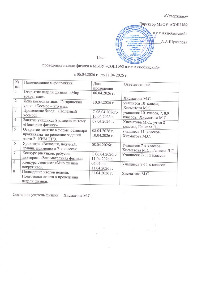 С 06.04- 11.04.2026 г. в нашей школе проходит неделя физики. План