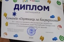 Акселератора предпринимательских идей. Команда нашей школы «Охотники за бактериями» в составе 4х учеников 7Б класса: Хуснуллин Ильдан, Максютин Олег, Мубаракшина Риана и Абдуллина Розалина под руководством учителя биологии Музафаровой Фании Радамисовны достойно защитили свой бизнес проект и заняли почётное первое место! -