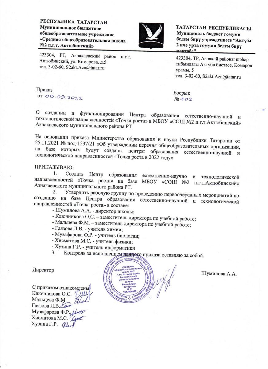 Положение о центре образования естественно-научной и технологической направленностей «Точка роста», создаваемом на базе МБОУ «СОШ №2 п.г.т. Актюбинский» (2022)План-график мероприятий на 2024-2025 учебный год