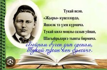 "Тукай иҗаты үлемсез" Бүген , 26 нчы апрель көнне Актүбә 3 нче гомуми урта белем мәктәбендә Габдулла Тукайның тормыш юлы һәм иҗатына багышланган әдәби кичә узды,укучылар шагыйрьнен тормыш юлына күзәтү ясадылар,белемнәрен бәяләделәр.Бнз Тукайлы халык,димәк безнен горуланырлыгыбыз бар.