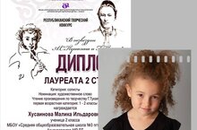 Поздравляем Хусаинову Малику, ставшую лауреатом 2 степени в республиканском творческом конкурсе «В созвездии А.С. Пушкина и Г.Тукая». Молодец! Желаем дальнейших творческих успехов тебе, Малика!